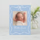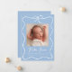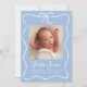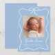 Bem-vindo ao seu bebê com este anúncio de nascimento elegante com um fundo azul macio acentuado por um delicado arco branco e uma faixa de fita. A foto do seu bebê é mostrada no centro, com o nome dele exibido em letras brancas e letras maiúsculas e detalhes de natalidade cuidadosamente organizados abaixo. Esta design personalizada combina elegância clássica com um sentimento moderno e fresco — perfeito para compartilhar suas notícias alegres com a família e os amigos.