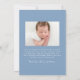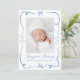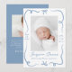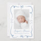 Compartilhe a alegria de sua nova chegada com este elegante anúncio de nascimento, mostrando uma foto de bebê vertical formada por fitas e arcos azuis empoeirados e desenhados à mão. O nome do seu bebê e as estatísticas de nascimento são apresentados num guião manuscrito de na moda. A parte traseira apresenta uma foto horizontal com espaço abaixo para sua mensagem pessoal. O design azul macio faz disso uma escolha perfeita para bebês ou um anúncio neutro em relação a gênero com um sentimento de eterno.