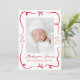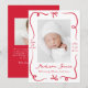 Anuncie a chegada do seu bebê com este doce e festivo anúncio de nascimento. Uma fita vermelha desenhada à mão e um arco traçam a foto vertical do seu bebê na frente, com o seu nome e os detalhes de nascimento mostrados num belo guião manuscrito. A parte de trás contém uma foto horizontal com espaço abaixo para sua mensagem pessoal. Este design vermelho ousado é ideal para os anúncios de natalidade no Natal ou no Dia do Namorados, mas eterno o suficiente para celebrar seu bebê a qualquer momento do ano.