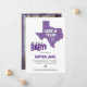 Anunciando o último bebê feito no Texas! Avise a todos quando seu pequeno anúncio de cores chegar às grandes escolas do Texas. Frente mostra o espaço para o nome do bebê e os detalhes de natalidade, junto com seus nomes. Tudo fica abaixo de um grande estado do Texas cheio de um padrão de erva-índia. Voltar para a sua imagem vertical. Design disponível em laranja queimado, marrom, roxo, verde, verde-escuro/amarelo-ouro, laranja e vermelho. Produtos correspondentes disponíveis.