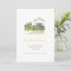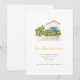 Um novo e encantador discurso/novo anúncio caseiro com uma ilustração aquática de uma casa de bungalow branca e azul com limoeiros e uma cerca de piquete branca.
