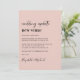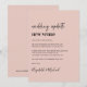 Anúncio de mudança de local de casamento cor-de-rosa minimalista moderno com "atualização de casamento novo local" escrito em uma mistura de tipografia cursiva e negrito (você pode personalizar para "nova data", "casamento menor", etc.). Personalize sua mensagem de mudança de planos, adicione seus nomes em uma tipografia de assinatura e adicione o site do seu casamento no verso ou deixe em branco.