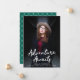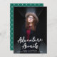 Anúncios de graduação de tendências que apresentam a foto vertical do formando com "Aguardas de Aventura" em letra branca de script manuscrito. Personalize a frente dos anúncios de graduação da Adventure Aguarda o nome do formando, o nome da escola e o ano de graduação. O anúncio se reverte para exibir um elegante padrão verde e branco de trellis.