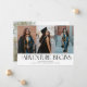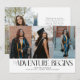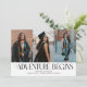 Cartão de foto de anúncio de formatura moderno e elegante com 3 fotos na frente e 1 no verso. O texto diz "a aventura começa". Adicione o nome do formando, informações e mensagem para personalizar este cartão.