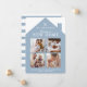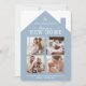Informe sua família e amigos que você está mudando para sua nova casa e como eles podem manter contato com nosso cartão de anúncio de várias colagens fotográficas. O design apresenta um simples design de forma caseira em uma cor azul moderna. Mostre as fotos especiais da sua família no design de colagem de quatro fotos, representando as janelas da casa. Personalize com seu nome de família, endereço e informações de contato. O reverso é projetado em um design de faixa simples para corresponder à cor da casa.