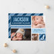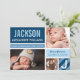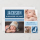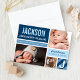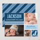 O cartão de anúncio de nascimento fotográfico ousado e moderno apresenta o primeiro nome do bebê em tipo superdimensionado em um bloco de cor azul-marinho com listras diagonais, estatísticas de nascimento em uma faixa azul nuvem e duas fotos na frente. O verso apresenta um layout de grade com uma terceira foto, uma mensagem de "Pais Orgulhosos" e uma inicial de monograma em um bloco listrado. Azul-marinho, azul nuvem, azul claro e branco criam uma paleta de tons azuis impressionante. Todas as cores e textos são totalmente personalizáveis.