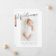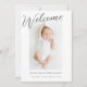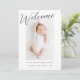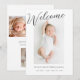Anúncio de nascimento de Foto do Bebê de Boas-vindas. Cartão de aviso de nascimento com várias fotos, com lugar para uma foto de bebê na frente e três fotos menores na parte de trás. Design minimamente moderno com roteiro Bem-vindo na frente do anúncio de nascimento.