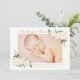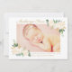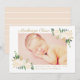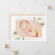 Este lindo cartão de anúncio de nascimento com foto apresenta a sua bebê com uma foto de recém-nascida emoldurada por rosas brancas em aquarela, folhagens e detalhes em folha de ouro. Nome em grafia dourada com detalhes do nascimento e uma mensagem de "Amor" dos pais. A paleta elegante de creme, dourado, rosa e verde dá um toque clássico de jardim. Um padrão de listras horizontais em pêssego e branco adorna as costas. As cores dourado e rosa podem ser modificadas. Todo o texto é totalmente personalizável.