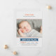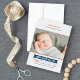 Anuncie o seu calouro do ano com este cartão de anúncio de nascimento fotográfico temático de beisebol, apresentando um cabeçalho "Apresentando o Mais Novo Membro da Nossa Equipe" em letras esportivas. O nome do bebê aparece em uma faixa azul marinho com estatísticas de nascimento exibidas em uma grade estilo placar. Detalhe de costura de beisebol vermelha e listras diagonais cinza claro completam o visual. Uma mensagem de texto "Recebido com Amor" e todo o texto são totalmente personalizáveis.