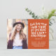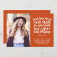 Anuncie sua formatura em segundo grau à sua família e amigos em estilo com este moderno cartão de anúncio de fotos cristãs.Este modelo apresenta sua foto à esquerda e à direita é um verso bíblia em uma tipografia moderna de escrita branca que lê "Deus tem mais em sua loja do que você pode imaginar. Ephesianos 3:20" com sua classe/ano, nome, nome da escola e data para você personalizar em um fundo laranja. A parte de trás do cartão é laranja. Parabéns pela sua formatura! Desenhada pela artista Susan Coffey.