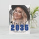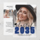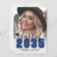 Classic Modern Graduation Announcement. The front features a full-page photo with a white gradient at the bottom that fades seamlessly into the image. Over the gradient, "2026" appears in a bold blue classic school-style font. Just above it, "Class of" is written in elegant black script. To the left of the year is a small, customizable graduation cap icon. Below the year, the graduate's name and school name are prominently displayed. All colors can be customized to match school colors or personal preferences.