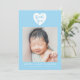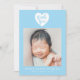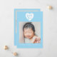 Este na moda e elegante cartão de modelo de anúncio de dois lados com fotografia apresenta 2 fotos (frente e verso) do seu bebê recém-nascido, texto personalizado que pode ser personalizado, e um coração branco com um dentro de texto tipográfico que diz "obrigado você" no topo sobre um fundo azul. Personalize este produto adicionando o nome do seu bebê recém-nascido, imagens, estado de nascimento e os nomes dos pais.