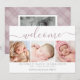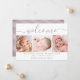 Anuncie a chegada da sua bebê com este anúncio de nascimento moderno de dupla face. A frente apresenta uma colagem de três fotos de algumas das suas fotos favoritas e BOAS-VINDAS em uma escrita à mão em rosa velho empoeirado. Personalize com o nome do seu bebê, data de nascimento, estatísticas de nascimento e nomes dos pais.
