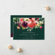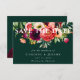 Bonito aquarela flores boêmicas, penas e folhagem botânica em tons de burgundy, roxo, creme, amarelo, pêssego, rosa e verde, Salva de Casamento o Cartão de Data. Os fundos, mostrados em verde escura esmeralda, podem ser personalizados.