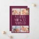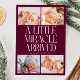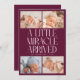 Modern Christmas theme birth announcement card featuring a bold typography text that says "a little miracle arrived" with 4 of your newborn pictures. This is a birth announcement card for the holiday seasons! Add your pictures, birth stats, and a message! The background is cranberry.