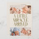 Modern Christmas theme birth announcement card featuring a bold typography text that says "a little miracle arrived" with 4 of your newborn pictures. This is a birth announcement card for the holiday seasons! Add your pictures, birth stats, and a message! The background is cream.