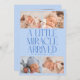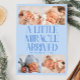 Modern Christmas theme birth announcement card featuring a bold typography text that says "a little miracle arrived" with 4 of your newborn pictures. This is a birth announcement card for the holiday seasons! Add your pictures, birth stats, and a message! The background is icy blue.