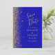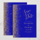 A borda esquerda deste elegante casamento moderno salve o cartão de data apresenta uma borda falsa dourada. O texto personalizável combina uma letra pálida de cor dourada, uma letra copperplate e uma letra itálico num fundo azul real. O verso apresenta um design azul real e dourado.