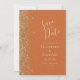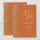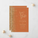 A borda esquerda deste elegante casamento moderno salve o cartão de data apresenta uma borda falsa dourada. O texto personalizável combina manuscrito pálido de cor dourada, fontes copperplate e itálico em um fundo laranja queimado. O verso apresenta um design de cor laranja e ouro correspondentes.