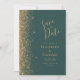 A borda esquerda deste elegante casamento moderno salve o cartão de data apresenta uma borda falsa dourada. O texto personalizável combina manuscrito pálido e dourado, fontes em copperplate e itálico em um fundo verde escuro. O verso apresenta um design verde e dourado correspondentes.