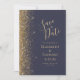 A borda esquerda deste elegante casamento moderno salve o cartão de data apresenta uma borda falsa dourada. O texto personalizável combina manuscrito pálido de cor dourada, fontes copperplate e itálico em um fundo azul escuro. O verso apresenta um design azul escuro e dourado.