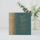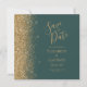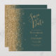 A borda esquerda deste elegante casamento moderno salve o cartão de data apresenta uma borda falsa dourada. O texto personalizável combina manuscritos dourados, copperplate e fontes itálicas em um fundo verde escuro. O verso apresenta um design verde e dourado correspondentes.