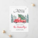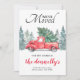 Cartão de mudança com tema rústico de inverno com fundo branco simples, árvores de abeto pintadas à mão, um caminhão vermelho vintage, uma árvore de Natal e um modelo de novo endereço fácil de personalizar.
