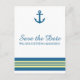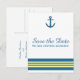 Elegante e clássico cartão postal de aviso prévio com âncora náutica e uma variedade de listras em azul-marinho escuro e amarelo. Este aviso prévio com tema náutico de praia pode ser facilmente personalizado com os detalhes do seu casamento. Para mais opções de personalização, clique no botão Personalizar.