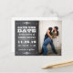Rústico e divertido com rabiscos e desenhos em abundância em um fundo de lousa de giz falsa. Este cartão postal de Save the Date divertido e caprichoso apresenta uma foto do casal feliz.