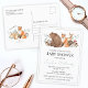 convite de chá de bebê com tema de aquarela da floresta com animais: urso, raposa, cervo, ouriço, cogumelos e folhas da floresta