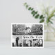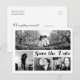Personalize este cartão-postal de casamento moderno e elegante com data de "Save the Date" na horizontal, projetado com belo texto em letra cursiva preta sobre um fundo branco limpo. Substitua as quatro imagens da colagem do modelo com suas 4 fotos favoritas. Uma das imagens deve ser uma foto panorâmica horizontal ampla e as outras três, menores. Para obter os melhores resultados, use fotos de alta resolução. Altere também todas as informações do modelo em ambos os lados com as suas. Este design tem a seguinte redação: "Estamos nos casando! (Com a data do casamento) E gostaríamos que você reservasse a data para poder compartilhar nosso dia especial. Convite formal a seguir." Você pode alterar as palavras com as suas.
