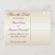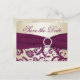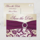 Este cartão postal de damasco de ameixa e champanhe para salvar a data tem uma fita falsa e um broche de jóias e combina com o convite de casamento mostrado abaixo. Se você precisar de outros itens correspondentes neste design, envie um e-mail para o seu pedido para niteowlstudio@gmail.com.