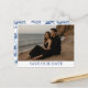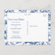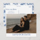Procurando uma maneira elegante de anunciar o seu casamento? Este cartão-postal personalizável de "guarde a data" permite que você faça o upload da sua foto de noivado favorita, mantendo o design sofisticado e moderno. Com uma disposição de tipos elegante que combina com roupas mais escuras e cenários de praia, o verso apresenta um padrão azul de chinoiserie atemporal para um acabamento clássico. Perfeito para casamentos na costa, casais modernos ou qualquer pessoa que queira um toque refinado e pessoal.