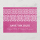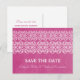 Cartão postal de data de salvamento moderno boêmio elegante e sofisticado com uma borda de redemoinho única e um fundo com aparência de papel vintage em magenta. Este cartão postal elegante é perfeito para anunciar o seu casamento com tema asiático ou boêmio. Fácil de personalizar, basta adicionar os detalhes do seu casamento nos campos de texto fornecidos. Clique em "Personalize" para encontrar mais opções de personalização.