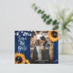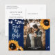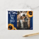 Cartões postais de foto para salvar a data do casamento com flores rústicas, apresentando girassóis e luzes de corda em um fundo de madeira de celeiro. Design de cartão ideal para uma festa de casamento rústica em azul marinho inspirada em girassóis.
