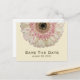 Um cartão postal de casamento para salvar a data com uma imagem de uma gerbera margarida rosa e branco esbranquiçado espreitando do topo da frente. Personalize o texto na frente e no verso.