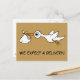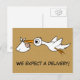 Cartão postal de gravidez fixe. Um cartão postal de cartão engraçado com cegonha com bebé e um texto pessoal: Estamos à espera de uma entrega! A maneira perfeita e original de dizer aos seus amigos que está à espera de um bebé!