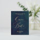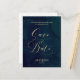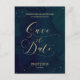 Um cartão postal de "salve a data" em caligrafia, apresenta um fundo de aquarela azul escuro com a palavra em dourado.