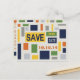 Cartão postal de salvar a data abstrato de Pop Art colorido com design gráfico por Artinspired. O design moderno apresenta quadrados e retângulos. A paleta de cores inclui azul-marinho, laranja, verde, amarelo e tons de cinza. Este cartão postal de salvar a data funciona bem para casamentos, aniversários, festa surpresa, formatura, festa de 16 anos, bar mitzvah, bat mitzvah, reuniões, arrecadações de fundos, festas de feriado, festas de Ano Novo, chás de bebê e mais.