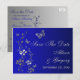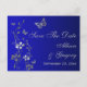 Este cartão postal de salvar a data floral azul real, azul naval e cinza prateado tem borboletas e flores que combinam com o convite de casamento mostrado abaixo. Se você precisar de outros itens correspondentes neste design, envie um e-mail para o seu pedido para niteowlstudio@gmail.com.