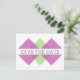 Cartão postal de Salvar a Data moderno e chic com triade geométrica, apresentando um design de triângulo elegante em fucsias e verdes radiantes. Fácil de personalizar, este design simples, mas elegante, pode ser personalizado com os detalhes do seu casamento. Clique em "Personalize" para encontrar mais opções de personalização.