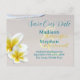 Cartões postais de salvar a data de casamento com tema tropical. Anúncios de casamento acessíveis com modelos para todas as informações, incluindo viagens e acomodações de hotel. Flores de plumeria na areia da praia e texto modelo impresso.