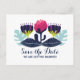 Cartão postal moderno e elegante de salvar a data floral funky com uma variedade colorida de folhagens azul-escuras e pervinca e flores magenta rosa e roxas estilizadas. Este cartão postal de salvar a data chic e trendy pode ser personalizado com os detalhes do seu casamento próximo. Para mais opções de personalização, clique no botão Personalize.
