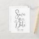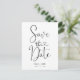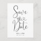 Cartão postal simples branco e preto para salvar a data com uma caligrafia com um título em forma de coração. Este design moderno e simples também inclui uma mensagem pronta para edição para os convidados no verso.