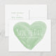 Cartão Postal de Salvar Data de Coração com Aquarela moderno e elegante com um coração de aquarela verde com aparência de pincelada caprichosa e encantadora. Este cartão de salvar data é fácil de personalizar com os detalhes do seu casamento. Para mais opções de personalização, clique no botão Personalizar.