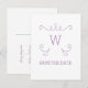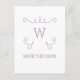 Cartão postal de Salve a Data moderno e simples com Monograma de Florescimento Caprichoso, apresentando um motivo de redemoinho elegante em roxo. Fácil de personalizar, basta adicionar sua inicial e detalhes do casamento nos campos de texto fornecidos. Clique em "Personalize" para encontrar mais opções de personalização.