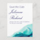 Um cartão postal de "save the date" em aquarela moderno e elegante, apresenta um mar turquesa abstrato, todos os detalhes são grafados em uma mistura de tipografia moderna e caligráfica.
