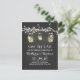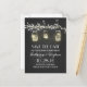 Cartão postal de SAVE THE DATE com quadro-negro rústico e potes de pedreiro com luzes penduradas cinzas.