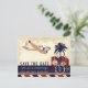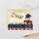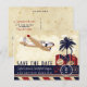 Um cartão postal inspirado no vintage para salvar a data de um casamento com tema de viagem. Mostrado em tons de azul-marinho, vermelho-escuro, branco e marrom-claro. Personalize com seus nomes, data do casamento e destino do casamento!