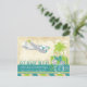 Um cartão postal inspirado no vintage para salvar a data de um casamento com tema de viagem. Mostrado em tons de azul e verde brilhantes. Personalize com seus nomes, data do casamento e destino do casamento!